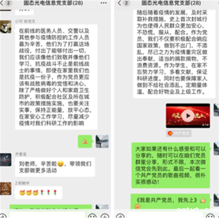 所属各党支部(总支)、党小组积极响应。党日活动内容主要分为开展党员“自学+讨论”及缴纳党费两部分。在“自学+讨论”环节,党员们重点学习了《中共中国科学院直属机关委员会转发〈关于进一步加强中央和国家机关疫情防控有关工作的通知〉的通知》、《中共中国科学院党组关于加强党的领导在防控疫情斗争中充分发挥党组织和广大党员、干部作用的通知》、《半导体所党委致全体共产党员的倡议书》等三个文件重要精神。党员们在认真自学文件后通过微信群展开了充分的讨论,分享了对统一行动、听从指挥的认识,对疫情期间共产党员及科技工作者的使命和担当,对参与疫情防控前线工作人员的敬意等方面的心得体会。固态光电信息党支部还通过微信群组织党员共同在线观看了《我是共产党员,我先上》歌曲视频。在缴纳党费环节,大家做到不聚集,通过网络平台按时足额缴纳党费。
